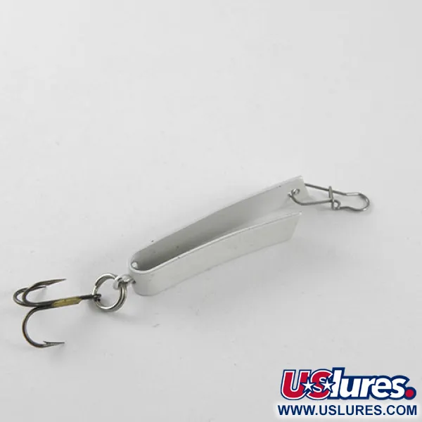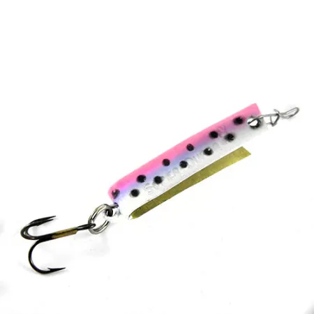 Tato miniaturní plandavka o hmotnosti přesně 2,5 g (3/32 oz) vykazuje charakteristický tvar písmene „U“, kterým se značka South Bend proslavila u modelu Super-Duper 502. Tělo o délce 3 cm (1 1/4") s produktovým kódem 1057 nese pečlivě nanesený vzor Trout, tvořený růžovo-stříbrným přechodem s výraznými černými tečkami. Vnitřní povrch ohýbaného kovu odráží teplý mosazný tón a vytváří odlesk, který kontrastuje s lakovaným vnějškem. Tento exemplář vyrobený v USA vykazuje výjimečnou péči, získal hodnocení stavu 5/5 s čistým hardwarem a lesklým povrchem. Originální ražené písmo zůstává na vnějším okraji ostré a nástraha je osazena továrním trojháčkem a karabinkou.