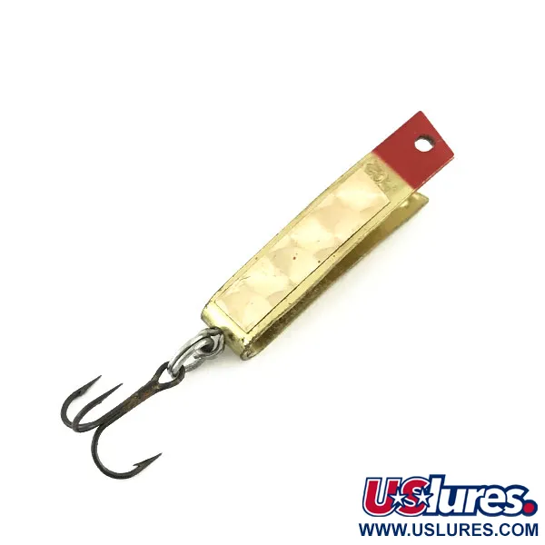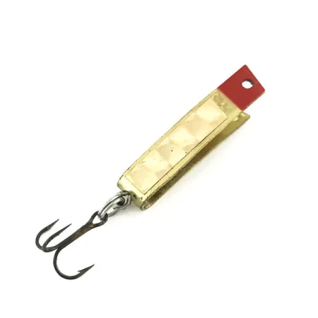 Tento exemplář South Bend o délce 1 1/4" (3 cm) se vyznačuje charakteristickým tvarem U z ohýbaného kovu, který definuje Super Duper 502. Pozlacený exteriér je detailně zpracován s texturovaným, diamantům podobným fasetovým vzorem, doplněným pevným červeným akcentem u očka pro vlasec. Tato nástraha o hmotnosti 3/32 oz (2,5 g), označená produktovým kódem 8616, spojuje vlastnosti plandavky a rotačky do jediného kompaktního profilu. Na zadní straně mosazného těla je jasně vyraženo „PAT NO 2,710,478“, což odráží její historický původ výroby v USA. Exemplář si zachovává plný původní lesk, je ve stavu 5/5 s čistým kováním a ostrým trojháčkem zajištěným kroužkem.