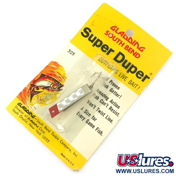 Poniklované povrchy v kombinaci s výraznou červenou špičkou a bílým kostkovaným vzorem odlišují tuto klasickou americkou nástrahu. Tato nástraha South Bend Super-Duper 503, katalogizovaná pod kódem 4661, váží 1/8 oz (4,3 g) a měří 1 1/2 palce (3,5 cm) na délku. Tento konkrétní kus je nepoužitý, uchovaný v původním žlutém obalu z éry Gladding z továrny v South Otselic ve státě New York. Tenké kovové tělo je vytvarováno do ikonického ohybu ve tvaru U, díky němuž se Super-Duper stal na desítky let základem pro lov pstruhů a okounů. Barevné provedení Nikl / Červená zůstává zářivé a vykazuje vysoce kvalitní pokovení typické pro výrobu South Bend z poloviny století. Na ocase je bezpečně upevněn jeden jednoháček, určený pro nahazování nebo trolling na lehkých šňůrách.