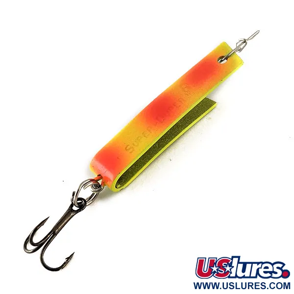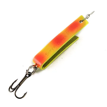 Vlastnosti reagující na UV světlo definují model Super-Duper 503 UV, což se projevuje zářivou reakcí jeho chartreuse a oranžovo-červené povrchové úpravy pod ultrafialovým světlem. Tato kompaktní, v USA vyrobená nástraha od South Bend o délce 1 1/4" (3 cm) je zkonstruována z jediného kusu ohýbaného kovu, což je konstrukční volba, která ji odlišuje od tradičních plandavek. Na boku je jasně viditelný ražený nápis „SUPER-DUPER“, který zdůrazňuje tradici modelu tvořícího přechod mezi rotačkou a plandavkou. S hmotností 1/8 oz (4,3 g) je ideální pro lov pstruhů nebo okounů na lehkou přívlač. Tento exemplář je ve vynikajícím stavu s hodnocením 5/5, přičemž původní lak zůstává sytý a osazení – včetně zadního trojháčku a horní karabinky – nevykazuje žádné známky používání. Tento konkrétní model 503 pod kódem produktu 12331 je vybaven UV reaktivním nátěrem, který zajišťuje vysokou viditelnost v hlubších nebo přikalených vodách.