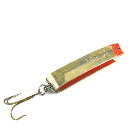 Ražba na pozlaceném kovovém těle odhaluje ikonický název South Bend Super-Duper 509, charakteristický znak rybářského designu poloviny minulého století. Tato nástraha o délce 5,5 cm (2 1/4") a hmotnosti 11 g (2/5 oz) se vyznačuje typickým ohybem ve tvaru U, který odhaluje její zářivě červený vnitřek. Tento exemplář, uváděný pod produktovým kódem 0599, vykazuje mírné, přirozené opotřebení, což mu vynáší solidní hodnocení stavu 4/5. Osazení tvoří jeden trojháček připevněný pomocí kroužku v místě ohybu, zatímco špička je předvrtána pro přímé navázání vlasce. Metalický povrch zůstává jasný, přičemž jméno výrobce a označení „Pat. Pend.“ jsou na horní straně stále ostré a čitelné.