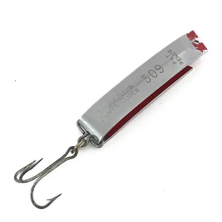Značka 'South Bend SUPER-DUPER 509', jasně vyražená do leštěného niklového povrchu, identifikuje tuto kovovou klasiku o délce 5,5 cm (2 1/4"). Tato výroba společnosti Luhr Jensen, katalogizovaná pod kódem produktu 8413, se vyznačuje ikonickým ohýbaným designem ve tvaru U, který poskytuje výraznou siluetu pro přívlač nebo trolling. Vnější tělo představuje reflexní niklový povrch, zatímco vnitřek je vyveden ve výrazné červené barvě, což vytváří vysoce kontrastní vizuální profil. Nástraha váží 11 g (2/5 oz) a je vybavena ostrým trojháčkem upevněným v základně ohybu. Na konci ocasu si můžete všimnout rytiny 'PAT. PEND.' spolu s továrním otvorem pro připevnění vlasce. Tento exemplář získal hodnocení stavu 5/5, vykazuje dobře zachovalé kovové povrchy a drobné, autentické opotřebení laku na červeném vnitřním nátěru, které podtrhuje jeho vintažní historii.