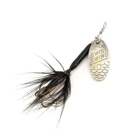 Francie je domovem této rotační třpytky o hmotnosti 1,6 g (1/16oz), která představuje klasický evropský přístup k designu ultralehkých nástrah. S délkou 4,5 cm (1 3/4") vyniká Swiss Swing 0 (kód produktu 12621) od Renosky Lures raženým stříbrným listem s detailním šupinovým vzorem v dolní části. Černé tělísko je doplněno trojháčkem s černým peřím, což vytváří vysoce kontrastní stříbrno-černý profil. Ve stavu 5/5 jsou kovové povrchy lesklé a peří zůstává husté a pevné. List je jasně označen názvem modelu a velikostí a k drátěnému rámu je připevněn tradičním třmenem.