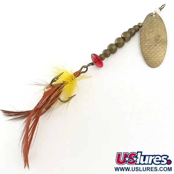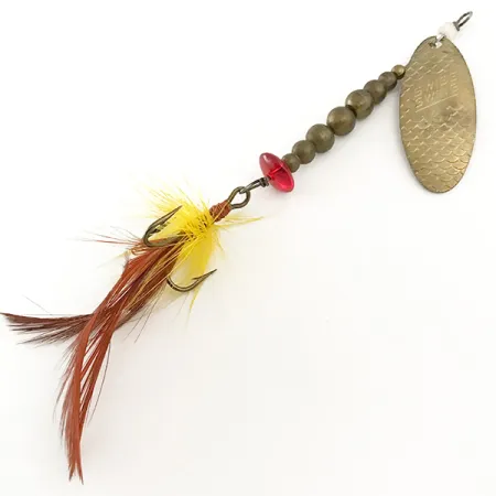 Odstupňované mosazné korálky lemují drátěnou osu této ve Francii vyrobené rotační třpytky, což jí dodává výrazný profil zatížení a klasický vzhled. Oválný mosazný list s raženým názvem Swiss Swing má na svém povrchu strukturovaný šupinový vzor pro jedinečný odlesk. Tento exemplář s kódem produktu 6645 váží 7 g (1/4 oz) a měří 8,5 cm (3 1/4"), což z něj činí ideální volbu pro lov pstruhů nebo okounů. Jediný broušený červený korálek slouží jako bod útoku přímo nad peřovým trojháčkem, který je osazen kombinací žlutého a hnědého srpkového peří. Malý bílý korálek na horním očku zajišťuje hladkou rotaci třmenu při plynulém přitahování. Tato vintage nástraha je ve vynikajícím stavu s hodnocením 5/5. Kovové části jsou lesklé a peřová vazba je bohatá a pevně fixovaná červenou nití.