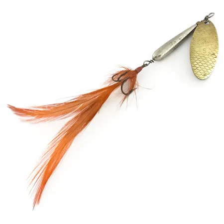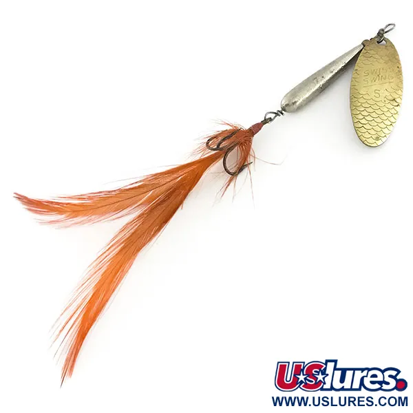 Rotační list z mosazi se vzorem šupin o celkové délce 8 cm (3 1/4") poskytuje výraznou texturu, která zachycuje světlo jinak než hladký povrch. Kolem trojháčku tohoto francouzského exempláře, uváděného pod kódem produktu 9438, je pečlivě uvázáno jasně oranžové peříčko. Poniklované kapkovité tělo poskytuje hmotnost 9 g (1/3 oz) nezbytnou pro stabilní nahazování. Renosky Lures uvedla tyto evropské vzory na trh a list je jasně označen ražbou 'Swiss Swing 5', což dokládá jeho původ. Každá součást zůstává ve vynikajícím stavu, kovové povrchy i opeření vypadají velmi zachovale, což odpovídá hodnocení 5/5. Drátěná osa je rovná a třmen umožňuje, aby mosazný list správně dosedal na niklové tělo.