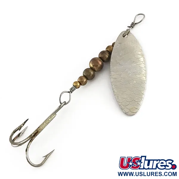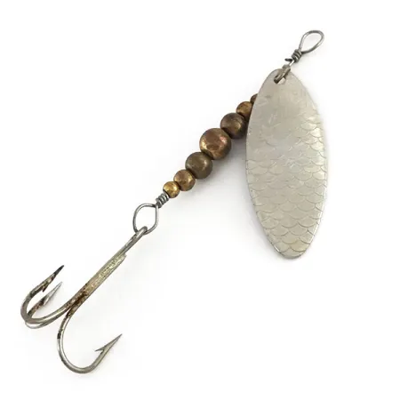Na stříbrném listu této rotační třpytky Renosky Lures Swiss Swing o hmotnosti 4 g (1/8 oz) je vyražen výrazný šupinatý vzor. Tento konkrétní model s kódem produktu 9171 měří celkem 7 cm (2 3/4"). Tělo je tvořeno šesti odstupňovanými mosaznými korálky, které poskytují potřebnou váhu pro nahazování a kontrolu hloubky vedení. Trojhůček je pevně připevněn k drátěnému očku v zadní části, což dokládá robustní kvalitu zpracování typickou pro Renosky. Zadní strana listu je hladká a leštěná pro dosažení jasného odlesku. Tento kus je ve stavu 5/5, přičemž drátěné omoty u horního očka i upevnění háčku zůstávají pevné a bezpečné. Kombinace texturovaného stříbrného listu a mosazných korálků z ní činí klasický příklad designu tradičních rotačních třpytek.