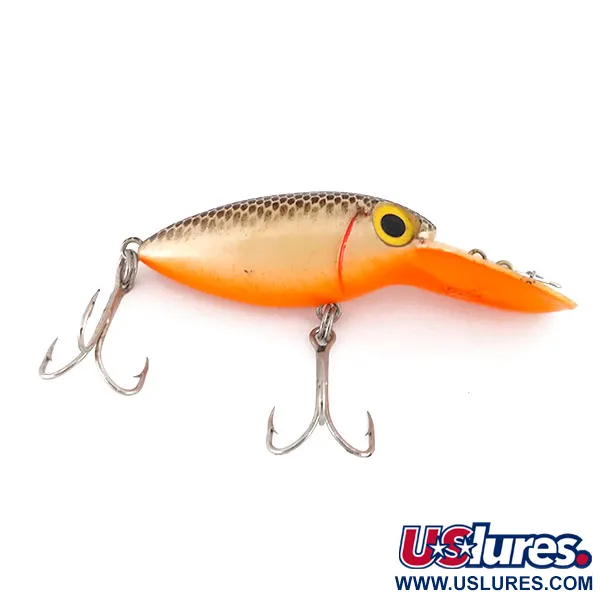 Spodní polovině dominuje oranžová barva, která přechází do krásně zpracovaného stříbrného a zlatého šupinového vzoru na klenutém hřbetu. Tento Willy’s Worm, vyrobený společností The Producers v USA, nese kód produktu 9588 a je ve stavu 5/5. Nástraha o délce 2" (5 cm) a hmotnosti 1/4 oz (8 g) je vybavena výraznou naddimenzovanou lopatkou určenou pro hlubinnou prezentaci. Velké žluté oči s výraznými černými zornicemi jsou charakteristickým znakem tohoto modelu a vytvářejí odvážný kontrast k texturovaným šupinám. Originální výbava zahrnuje dva trojháčky se stříbrnou povrchovou úpravou, jeden na břiše a jeden na ocase. Předem připevněná karabinka na široké, zaoblené lopatce zaručuje, že nástraha zůstala přesně v takovém stavu, v jakém opustila továrnu. Přechod z jasně oranžového břicha k tmavšímu metalickému hřbetu odráží kvalitu výroby tehdejší éry.