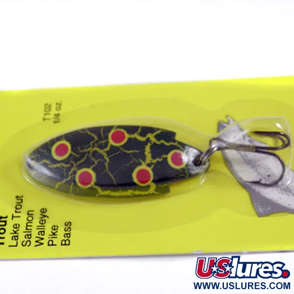 Tato americká plandavka Thomas Buoyant o hmotnosti 7 g (1/4 oz) je osvědčenou klasikou pro lov pstruhů a mnoha dalších druhů dravců. Tělo o délce 4,5 cm (1 3/4") má vzor „Frog“, který se vyznačuje tmavým základem s výrazným žlutým krakelováním a jasně červenými tečkami. Nástraha je nepoužitá v původním balení na žlutém kartonu, který uvádí její účinnost pro druhy od jezerních pstruhů a lososů až po štiky a okouny. Model s kódem produktu 0740 je osazen továrním trojháčkem připevněným přes robustní kroužek. Nápis „MADE IN U.S.A.“ v rohu obalu potvrzuje původ a odkazuje na dlouhou výrobní tradici společnosti Thomas Spinning Lures. Tato barevná varianta s označením T102 je navržena pro vysokou viditelnost při přívlači i trollingu.