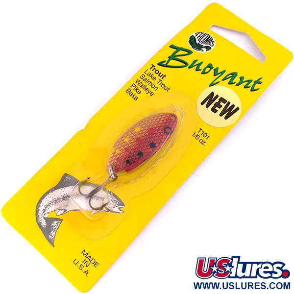 Tato kovová plandavka Thomas Buoyant o hmotnosti 5 g (3/16 oz) má povrchovou úpravu Red Trout s texturovaným vzorem šupin na měděném podkladu, doplněnou výraznými červenými, černými a žlutými znaky. Tato nástraha o délce 4 cm (1 1/2"), vyrobená v USA, nese kód produktu 10194 a je typickým příkladem designu Thomas Buoyant. Její jedinečný, asymetrický tvar těla je navržen speciálně pro nahazování a trolling, kde je vyžadován výrazný pohyb ze strany na stranu. Tento exemplář je nepoužitý, v původním žlutém blistrovém balení s hodnocením stavu 6. Na obalu je uvedena účinnost pro různé druhy ryb včetně candáta, štiky a okouna, ačkoli zůstává legendární volbou zejména pro milovníky lovu pstruhů. Osazení tvoří jeden pojistný kroužek a ostrý trojháček, přičemž oba prvky vykazují čistý povrch, který se očekává u dobře zachovalého vintage kousku.