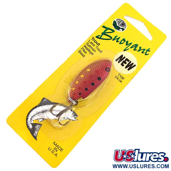 Pozlacená mosaz tvoří základ pro detailní povrchovou úpravu Red Trout této 7g (1/4 oz) plandavky. Tento nepoužitý exemplář v původním žlutém blistru představuje tradiční americké výrobní standardy společnosti Thomas Spinning Lures, Inc. se sídlem v Hawley v Pensylvánii. Vzor se skládá z tmavě červené textury šupin doplněné černými a žlutými tečkami, což má napodobit vzhled malého pstruha. Obal označený kódem produktu 10282 odkazuje také na číslo položky T102GR, které značí zlato-červené barevné schéma. Jasně stříbrný trojháček je k zadní části připevněn pomocí kroužku a zůstává v původním stavu z výroby. Rybáři používají nástrahy Thomas Buoyant již celá desetiletí při lovu druhů, jako jsou lososi, candáti a štiky v různých říčních i jezerních revírech. Podrobné pokyny na zadní straně karty doporučují nahazovat mírně proti proudu nebo přímo napříč proudem, aby bylo možné lépe kontrolovat hloubku během navíjení.