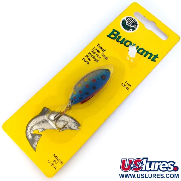 Výrazné červené, žluté a černé tečky doplňují povrchovou úpravu Modrý pstruh (Blue Trout) této 4 cm (1 1/2") kovové plandavky. Tento model Thomas Buoyant s produktovým kódem 10659 váží 5 g (3/16 oz) a odráží konstrukční dědictví sahající až k patentu značky z roku 1946. Společnost Thomas Spinning Lures se sídlem v Hawley v Pensylvánii se zaměřila na pokovování v klenotnické kvalitě pro vytvoření vysoce kontrastního odlesku. Jako nepoužitý exemplář si nástraha zachovává svůj původní tovární lesk bez známek opotřebení. Je osazena jedním trojháčkem a je určena pro různé techniky, včetně přívlače na pstruhy nebo trollingu na lososy a štiky. Nástraha zůstává připevněna na své originální žluté sběratelské kartě nad klasickou ilustrací skákajícího pstruha.