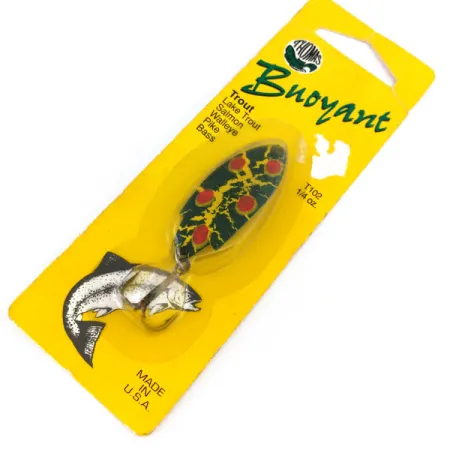 Tato plandavka o délce 4,5 cm (1 3/4") se vyznačuje výrazným vzorem „Red Dot Frog“, který je známý svou vysokou viditelností. S hmotností 7 g (1/4 oz) je tento model identifikován kódem produktu T102FRG (10836) a zůstává v původním žlutém továrním blistru. Nástraha je nepoužitá, vhodná do sbírky a má hodnocení stavu 5/5. Barevné provedení tvoří tmavě zelené a žluté kropenaté pozadí s pěti velkými kruhovými červenými tečkami. Tento přívlačový kousek vyrobila společnost Thomas Spinning Lures, Inc. v Hawley, PA. Původní obal vyzdvihuje univerzálnost pro druhy jako pstruh, losos a štika. Výbava zahrnuje jeden trojhák připevněný k ocasní části plandavky. Podrobné pokyny na zadní straně karty navrhují specifické techniky nahazování a vedení pro tekoucí i stojaté vody s důrazem na práci nástrahy v blízkosti dnových struktur.
