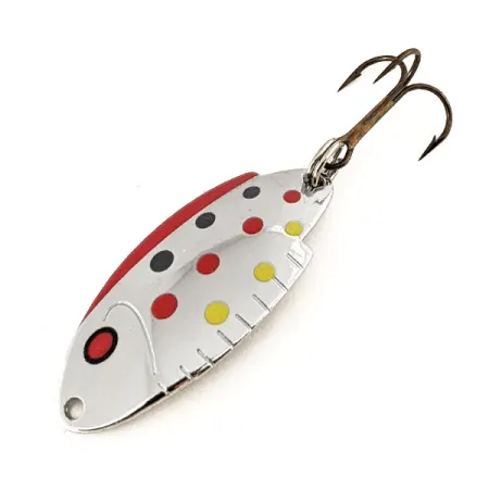 Poniklování slouží jako základ pro klasický vzor s červenými, černými a žlutými tečkami na lícní straně této 4 cm (1 1/2") nástrahy. Tato plandavka Thomas Buoyant (kód produktu 11248) o hmotnosti 5 g (3/16 oz) se vyznačuje tradičním tvarem, který po generace definuje americký lov pstruhů. Na zadní straně je jasně viditelné jméno výrobce a hluboko do kovu vyražené označení 'BUOYANT'. Výrazný červený akcent sleduje vnější křivku, zatímco líc doplňuje stylizované oko. Trojháček i kování zůstávají lesklé a ostré, což odpovídá stavu 5/5. Tento exemplář vyrobený v USA si zachovává vysoký lesk po celém těle a nátěr zůstává ostrý a sytý.