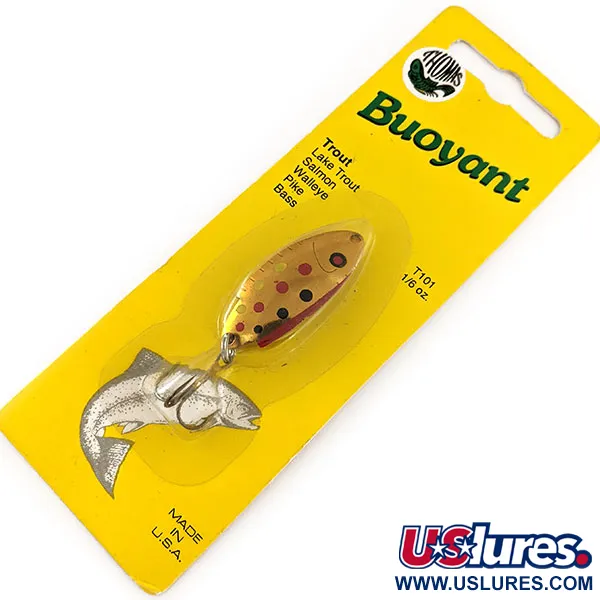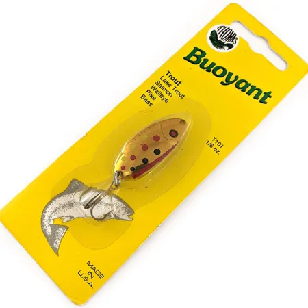 Tato vintage plandavka Thomas Buoyant ve výrazném vzoru Copper Trout s černými a červenými tečkami na zlatém podkladu je uchována v původním dobovém balení. Vyrobena v Hawley v Pensylvánii, tato 4cm (1 1/2") lžička je klasickým kouskem historie amerického rybářského náčiní od společnosti Thomas Spinning Lures, Inc. Hmotnost 4,7 g (1/6 oz) z ní činí univerzální volbu pro lov pstruhů, lososů a dokonce i candátů v různých vodních podmínkách. Tento konkrétní exemplář nese kód produktu T101B-G a je hodnocen stavem 6, což znamená, že je zcela nepoužitý a nikdy nebyl u vody. Výbava zahrnuje vysoce kvalitní trojhák připevněný pomocí robustního kroužku, což je standard pro tyto plandavky vyráběné v Hawley. Na zadní straně žluté karty podrobné pokyny uvádějí, že nástraha je účinná při nahazování napříč proudem v řekách nebo při vedení v různých hloubkách v jezerech. Razítko „MADE IN U.S.A.“ v levém dolním rohu obalu je dokladem dlouholeté výrobní tradice značky.