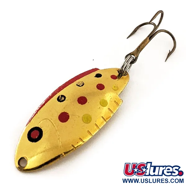 Vzory pstruha zlatého charakterizují tuto klasickou americkou plandavku, která vyniká jasně pozlaceným povrchem zdobeným červenými, žlutými a černými tečkami. S váhou 3/16 oz (5 g) a délkou 1 1/2" (4 cm) je tento Thomas Buoyant typickým kouskem historie rybářského náčiní vyrobeného v USA. Konvexní strana je detailně propracovaná s namalovaným červeným okrajem a malými prohlubněmi, které připomínají rybí ploutve, což zvyšuje vizuální atraktivitu pro sběratele i rybáře. Na zadní straně je do kovu vyražen název značky Thomas a označení modelu T101. Tento exemplář, identifikovaný kódem produktu 11974, si udržuje hodnocení stavu 5/5, přičemž zlatý povrch a malované detaily vypadají výjimečně zachovale. Plandavka určená pro nahazování nebo trolling je vybavena ostrým trojháčkem připevněným pomocí robustního kroužku.