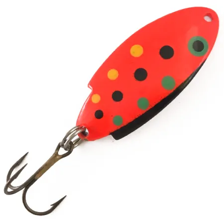Značení vyražené přímo do kovu na perleťově bílé straně identifikuje tento model o hmotnosti 3/16 oz (5 g) jako originální, v USA vyrobenou plandavku Thomas Buoyant. Tato nástraha o délce 1 1/2" (4 cm) se vyznačuje ikonickým vzorem Red Trout na své vypouklé straně, který tvoří žluté, černé a zelené tečky na sytě červeném podkladu. Tento konkrétní kus s produktovým kódem 4767 je zachován ve stavu 5/5 s čistou povrchovou úpravou na hlavní červené straně i na perleťově bílé zadní části. Značka Thomas zvolila pro tento model klasický kapkovitý profil, který je zde doplněn trojháčkem s bronzovou povrchovou úpravou a robustním kroužkem. Tyto plandavky se tradičně používají k přívlači na potocích nebo k trollingu na jezerech, kde hmotnost 5 g poskytuje dostatečnou zátěž pro přesné nahazování a kontrolu hloubky.
