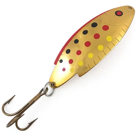 Tato plandavka s vyraženým označením modelu „T105“ a „THOMAS BUOYANT“ na své konkávní straně představuje klasický kousek americké rybářské historie z USA. Povrchová úprava Golden Trout je obzvláště působivá a tvoří ji leštěný zlatý podklad zdobený řadami červených, černých a žlutých teček, které napodobují zářivý bok pstruha. S délkou 8,5 cm (3 1/4") a hmotností 21 g (3/4 oz) má tato nástraha s produktovým kódem 4931 na svou velikost výrazný profil. Mosazné tělo obsahuje charakteristické leptané linie žaber a ploutví podél zadní hrany, které dodávají odleskům texturu. Robustní trojhák je zajištěn čistým kroužkem, což odráží odolný hardware očekávaný od značky Thomas. Pokud jde o stav, exemplář je hodnocen 5/5, vykazuje zrcadlový lesk a precizní nátěr. Přestože je na zadní straně nástrahy vyraženo 5/8 oz, její skutečná hmotnost 21 g (3/4 oz) z ní činí všestranný nástroj pro daleké nahazování i trolling.