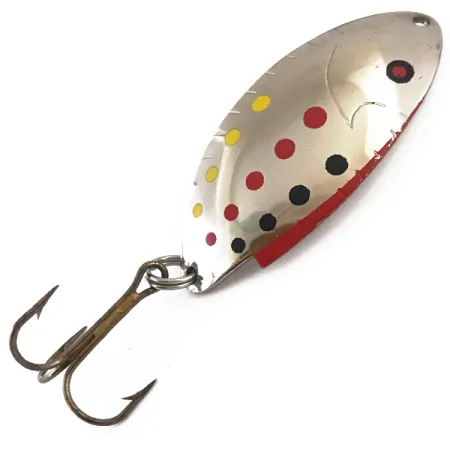 Značka „THOMAS BUOYANT 1/2 OZ USA“ jasně vyražená do leštěného niklového povrchu zadní strany potvrzuje původ této klasické americké plandavky. S délkou 2 1/4" (6 cm) a hmotností 1/2 oz (14 g) se tento exemplář vyznačuje charakteristickým kapkovitým profilem s reliéfním detailem ploutve, který je typický pro značku Thomas. Povrchová úprava tvoří lesklé niklování doplněné tradičním vzorem červených, žlutých a černých teček na konvexní straně spolu s výrazným červeným nátěrem podél jedné hrany. Tato konkrétní nástraha s produktovým kódem 4959 si zachovává svůj původní lesk a vykazuje hodnocení stavu 5/5. Výbava se skládá z robustního bronzového trojháčku připevněného pomocí pevného kroužku, vhodného pro přívlač nebo trolling při lovu druhů, jako jsou pstruzi a lososi. Malé očko pro vlasec je čistě proraženo v zúžené hlavě, což zajišťuje bezpečné spojení s koncovou montáží.