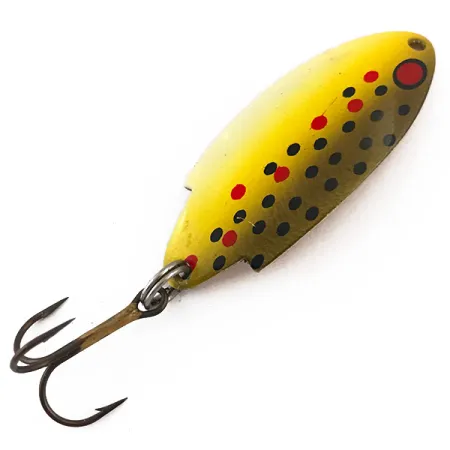 Identifikační značení THOMAS T102 BUOYANT 1/4 OZ jasně vyražené do pozlacené zadní strany potvrzuje identitu této klasické americké plandavky. Přední strana je vyvedena v zářivém vzoru Yellow Trout s přechodem ze žluté do zlaté barvy, zdobeným řadou černých a červených teček. Velká červená kruhová skvrna poblíž horního očka slouží jako hlavní vizuální bod útoku. Kovové tělo o délce 4,5 cm (1 3/4") a hmotnosti 7 g (1/4 oz) nese produktový kód 4960. Tento kus je ve stavu 5/5, má čistý povrch a originální osazení, včetně pevného kroužku a bronzového trojháčku. Konstrukce odráží vysoké standardy nástrah Thomas, přičemž zakřivený profil je speciálně navržen pro přívlač nebo trolling ve sladkovodních revírech.