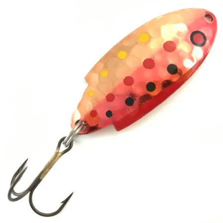 Texturovaný voštinový vzor definuje přední stranu této 7g (1/4 oz) plandavky a poskytuje víceúrovňový povrch pro zářivý povrch v barvě 'Copper Trout'. Tělo této 4,5 cm (1 3/4") dlouhé třpytky má unikátní tvar a na měděné zadní straně je vyraženo označení 'THOMAS T102 BUOYANT 1/4 OZ'. Barevná paleta je obzvláště působivá: sytě červený ocas přechází do světlejší růžové a zlaté střední části, doplněné řadou žlutých, červených a černých teček. Sběratelé tento model poznají pod kódem produktu 5174 – jde o klasický americký design z USA, který po desetiletí zůstává základem pro lov pstruhů a okounů. Osazení je ve vynikajícím stavu, s robustním trojháčkem připevněným pomocí kroužku ve spodní části. Vzhledem ke stavu 5/5 zůstává povrch jasný a značení je ostré a čitelné. Zúžený profil je vhodný jak pro nahazování v tekoucí vodě, tak pro lehký trolling. V horní části hlavy třpytky je čistě vyražen jeden otvor pro navázání vlasce.