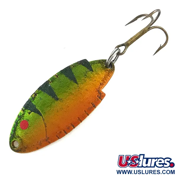 Tato plandavka o hmotnosti 5g (3/16oz) se vyznačuje klasickým tvarem lžíce, díky němuž jsou nástrahy Thomas po desetiletí základem pro lov pstruhů. Výrazný nátěr Fire Tiger je aplikován na texturovaný povrch přední strany s přechodem ze zelené do oranžové, doplněný výraznými svislými pruhy a jedním červeným okem. Zadní strana je v provedení leštěného zlata, s jasně vyraženou značkou Thomas, názvem modelu Buoyant a označením T101. Při délce 4cm (1 1/2") profil přesně odpovídá malé nástražní rybce, což z ní činí univerzální volbu pro nahazování v potocích i jezerech. Tato plandavka vyrobená v USA, vedená pod kódem 5359, zůstává ve stavu 5/5, přičemž háček i kroužky jsou ve výjimečně zachovalém stavu. Tvar nástrahy využívá mírně klenuté tělo určené pro nahazování a přitahování v různých sladkovodních prostředích.