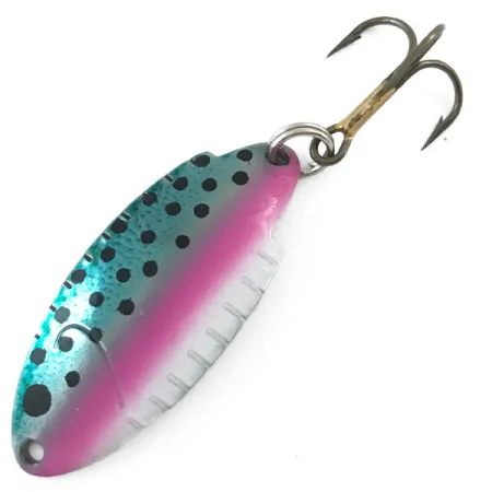 Na leštěné niklové zadní straně této 1 1/2" (4 cm) plandavky je jasně vyraženo označení hmotnosti 3/16 oz (5 g). Tato plandavka Thomas Buoyant, označená produktovým kódem 5544, vykazuje klasické barevné schéma Pstruh / Nikl s metalickým modrozeleným hřbetem a sytě růžovou boční čárou doplněnou výraznými černými tečkami. Ražené kovové tělo obsahuje charakteristické boční zářezy, což je designový prvek spojený s historií výroby této značky v USA. Ostrý, bronzový trojháček je připojen pomocí stříbrného kroužku v zadní části. Vzhledem k hodnocení stavu 5/5 má nástraha neuvěřitelně zachovalou povrchovou úpravu, přičemž vyražený text „THOMAS 3/16 OZ BUOYANT“ zůstává na reflexním niklovém povrchu ostrý a čitelný.