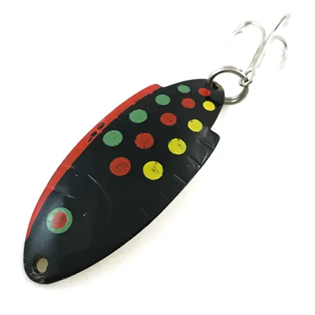 Název „THOMAS BUOYANT“ vyražený do žlutě lakované spodní strany zůstává na této 1 3/4" (4,5 cm) kovové plandavce ostrý a čitelný. Tento konkrétní exemplář s produktovým kódem 5545 nese ikonický vzor Black Trout – tmavý povrch zdobený rytmickou sekvencí zelených, červených a žlutých teček. Plandavka o hmotnosti 1/4 oz (7 g) je ve výjimečném stavu, hodnocena 5/5, s čistým povrchem a zachovalým lakem. Její konstrukce se vyznačuje mírným vyoseným ohybem a detailem boční ploutve, což ve vodě vytváří specifický profil, který je charakteristickým znakem nástrah Thomas vyráběných v USA. Výbava zahrnuje robustní kroužek v zadní části připojený k jasně stříbrnému trojháčku, zatímco jeden otvor v přední části slouží jako bod pro připevnění při nahazování nebo trollingu.