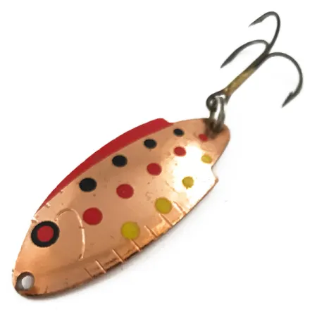 Na zadní straně je do kovu jasně vyraženo jméno „Thomas Buoyant“ spolu s označením hmotnosti 1/4oz (7g) a číslem modelu T102. Tato klasická plandavka s produktovým kódem 5546 měří 1 3/4" (4,5 cm) a vyznačuje se vysoce leštěným měděným povrchem, který sběratelé vyhledávají. Přední část zdobí řada lakovaných teček v černé, žluté a červené barvě, doplněná sytě červeným pruhem podél horní hrany a velkým okem ve stylu terče na špičce. Nástraha v hodnocení stavu 5/5 si zachovává svůj původní lesk a ostré kontury barev na hladkých i strukturovaných plochách. Kvalita zpracování odráží americký původ, zahrnuje odolný kroužek a standardní trojháček. Jemné vertikální ražby podél spodního okraje listu vytvářejí decentní strukturu šupin, která odráží světlo jinak než hlavní tělo.