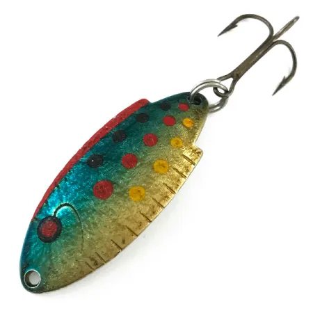 Na konvexní stranu této klasické plandavky je ručně nanesen zářivý vzor pstruha duhového s výrazným teal hřbetem a jasně žlutozlatým tělem. Váha 1/4oz (7g) z ní činí univerzální volbu pro nahazování v horských potocích nebo trolling v hlubších vodách. Mosazné tělo o délce 1 3/4" (4,5cm) má výrazný vykrojený ocas a hluboce ražené linie šupin podél spodního okraje. Na rubové straně zůstává leštěný niklový povrch výjimečně čistý, s originální ražbou modelu Thomas T102 a názvem „BUOYANT“. Tento exemplář, vedený pod kódem 5603, získal hodnocení stavu 5/5 a vykazuje pozoruhodně zachovalé červené, žluté a černé tečky na strukturovaném povrchu. Osazení tvoří pevný kroužek a ostrý trojháček, což odráží kvalitu výroby v USA.