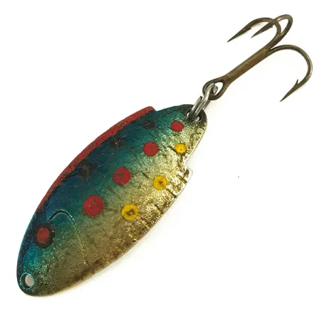Tato 4 cm (1 1/2") plandavka s vyraženým identifikátorem modelu T101 a názvem Buoyant na leštěné stříbrné zadní straně je stálicí americké rybářské historie. Nástraha o hmotnosti 5 g (3/16 oz) je postavena na strukturovaném, tepaném kovovém těle s klasickým vzorem pstruha duhového. Tato povrchová úprava zahrnuje tyrkysově modrý gradient podél hřbetu a sérii zářivých červených a žlutých teček na zlatavém podkladu. Tento exemplář s produktovým kódem 5644 je ve stavu 5/5 a zachovává si ostré detaily v laku i hluboce vyraženém písmu na zadní straně. Výbava zahrnuje bronzový trojháček připevněný pomocí jednoho kroužku na užším konci. Tato konstrukce od značky Thomas, určená pro přívlač a trolling, nabízí díky dvoubarevnému provedení vysoce kontrastní odlesky mezi barevnou přední částí a lesklou stříbrnou spodní stranou.
