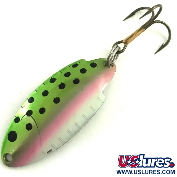 Tato v USA vyrobená plandavka vážící 3/16 oz (5 g) se vyznačuje klasickou povrchovou úpravou pstruh / stříbro, která napodobuje vzhled malého pstruha duhového. Tělo o délce 1 1/2" (4 cm) je na leštěné stříbrné spodní straně pečlivě vyraženo názvem Thomas Buoyant a informacemi o patentu. Její konvexní strana je zdobena sytě zeleným hřbetem a výraznými černými tečkami, které odděluje jemně růžový boční pruh. S hodnocením stavu 5/5 zůstává lak ostrý a kov jasný po celém asymetrickém rámu. Podél okraje jsou viditelné výrazné vroubky připomínající šupiny, což je technický detail navržený ke zvýšení odrazu světla při nahazování nebo trollingu. Nástraha je osazena robustním kroužkem a ostrým, bronzovým trojháčkem. Tento kus s produktovým kódem 5822 je skvěle zachovalým příkladem tradičního řemeslného zpracování z USA.