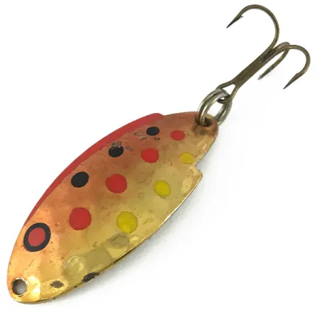 Tepaný zlatý mosaz vytváří vysoce reflexní povrch pro barevné provedení Hammered Golden Rainbow Trout, doplněné výraznými červenými, žlutými a černými tečkami. Tato plandavka vyrobená v USA, kód produktu 6824, je zachována ve stavu 5/5 a nevykazuje žádné známky použití v terénu. Při délce 4 cm (1 1/2") a hmotnosti 5 g (3/16 oz) má kovové tělo výrazný kapkovitý ohyb a texturovaný povrch pro maximální odlesky při nahazování nebo trollingu. Na zadní straně je jasně vyražena značka Thomas, číslo modelu T101 a název Buoyant. Je vybavena robustním kroužkem a bronzovým trojháčkem, přičemž veškerý originální hardware zůstal ve vynikajícím stavu.