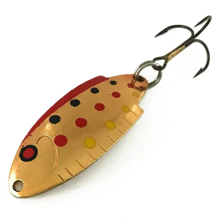 Lesklé měděné pokovení slouží jako základ pro povrchovou úpravu Golden Trout u tohoto modelu T102, který se vyznačuje výraznými červenými, žlutými a černými tečkami. Na zadní straně jsou jasně vyraženy údaje výrobce „THOMAS BUOYANT“ a hmotnost 1/4 oz (7 g), což potvrzuje, že jde o originální nástrahu vyrobenou v USA. Tento exemplář s produktovým kódem 7228 měří přesně 4,5 cm (1 3/4") na délku a je ve špičkovém stavu 5/5, bez jakýchkoli známek použití na leštěném kovu nebo originálním trojháčku. Konstrukce zahrnuje vroubkovanou oblast „žaber“ u ocasu a prohnutý profil, díky němuž je tento design po desetiletí základem pro lovce pstruhů a lososů. Kovové prvky, připevněné pomocí pevného kroužku, zůstávají lesklé a bez oxidace. Malé očko v přední části je přesně vyvrtané a připravené pro karabinku nebo přímé navázání vlasce pro nahazování do tekoucí vody.