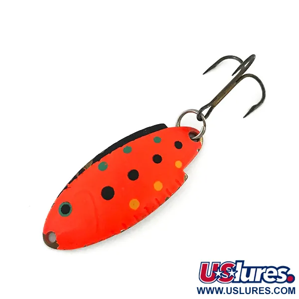 Tato klasická plandavka o hmotnosti 5 g (3/16 oz) vyniká vzorem Red Trout na niklovém základě. Kovové tělo o délce 4 cm (1 1/2") je vyvedeno v zářivé oranžovo-červené barvě s výraznými černými, žlutými a zelenými tečkami pro vysoký kontrast. Při vystavení UV světlu vyzařuje povrch silnou oranžovou záři, což je technický detail určený pro lov v kalné vodě nebo za snížené viditelnosti. Tento Thomas Buoyant s kódem 8550 je ukázkovým příkladem americké výroby, má raženou niklovou zadní stranu a robustní trojhůček upevněný pomocí kroužku. Lak i hardware jsou ve výjimečně zachovalém stavu (hodnocení 5/5). Tento exemplář dokládá tradiční výrobní techniky pro přívlač a trolling při lovu pstruhů a okounovitých ryb.