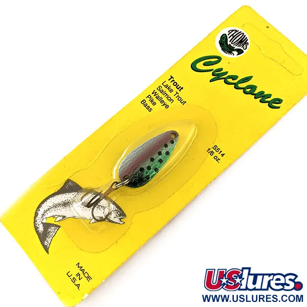 Ručně ražené v USA, kovové tělo této plandavky Thomas Cyclone váží 1/8 oz (4,3 g) a měří 1 1/2" (4 cm). Povrchová úprava Rainbow Trout se vyznačuje klasickým tečkovaným vzorem na zeleno-růžovém přechodu, který napodobuje přirozenou potravu druhů, jako jsou lososi a jezerní pstruzi. Tato konkrétní nástraha s kódem 11694 je nepoužitá a zatavená v původním žlutém papírovém obalu. Osazení tvoří jeden bronzový trojhák připevněný pevným kroužkem. Nástrahy Thomas Spinning Lures jsou známé svou kvalitou a tento kus je čistou ukázkou jejich amerického výrobního dědictví.