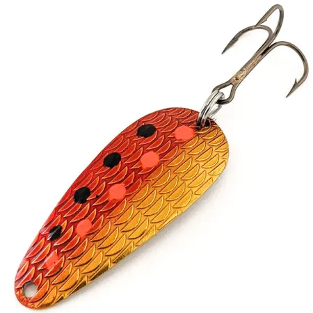 Na zadní straně se zlatou povrchovou úpravou je jasně vyražen nápis „THOMAS S515 1/4 OZ CYCLONE“, který identifikuje tuto klasickou americkou třpytku. Nástraha o délce 4,5 cm (1 3/4") a hmotnosti 7 g (1/4 oz) se vyznačuje výrazným reliéfním vzorem šupin na své konvexní straně. Tento strukturovaný povrch má zářivý oranžovo-zlatý gradient, dále doplněný ručně nanášenými červenými a černými tečkami. Zadní strana zůstává vysoce reflexní, v barvě leštěného zlata, což poskytuje vysokou viditelnost při nahazování nebo trollingu. Vyrobeno v USA pod kódem 12881, tento kus je ve stavu 5/5 s dokonalým povrchem. Trojháček je připevněn pomocí pevného kroužku a v přední části je otvor pro přímý návazec nebo karabinku.
