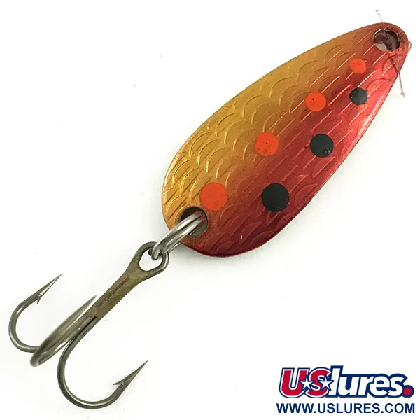 Reliéfní šupinová textura na konvexní straně dodává této 3 cm (1 1/4") plandavce jedinečný povrch. Nástraha v barevném provedení Rainbow Red Trout / Gold má zlatý základ přecházející do zářivě červené, doplněný střídajícími se oranžovými a černými tečkami. Tato Thomas Cyclone (kód produktu 5819) je vyrobena z mosazného polotovaru, který má na zadní straně vyražené jméno výrobce, označení „S514“ a značku „1/6 oz“, ačkoli oficiální hmotnost je 1/8 oz (4,3 g). Vyrobeno v USA, tento kus je osazen odolným trojháčkem zajištěným pevným kroužkem. Stav je hodnocen 5/5, vykazuje čistý tovární povrch bez známek použití nebo oxidace. Přídavný upevňovací bod u hlavy je ponechán volný pro přímý uzel nebo karabinku, což je běžné u nástrah určených pro přesné nahazování.