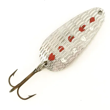 Tato v USA vyrobená plandavka o hmotnosti 7g (1/4oz) má kovové tělo s výrazným reliéfním šupinovým vzorem, který odráží světlo po celé délce 4,5cm (1 3/4"). Tento konkrétní model Thomas Cyclone, vedený pod kódem 7454, se vyznačuje klasickým stříbrno-červeno-bílým barevným provedením s ručně nanášenými barevnými akcenty na texturovaném stříbrném povrchu. Na zadní straně nástrahy je čistá ražba jasně identifikující model jako S515 Thomas Cyclone, vyrobený v USA. Osazení tvoří robustní bronzovaný trojháček připevněný pomocí spojovacího kroužku, což odpovídá původní tovární kvalitě. Ve stavu 5/5 zůstává stříbrný povrch jasný a malované detaily jsou na vintažní kus mimořádně zachovalé. Sběratelé ocení preciznost šupinového reliéfu, který je charakteristickým znakem výrobních technik Thomas pro zvětšení odrazné plochy. Horní očko je určeno pro přímé navázání vlasce nebo pro karabinku s obratlíkem, což je typické pro tradiční plandavky na pstruhy a okounovité ryby.