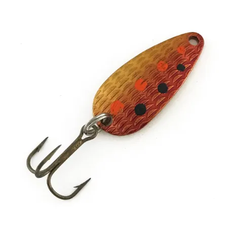 Přední strana této plandavky s hlubokou texturou připomínající šupiny je opatřena výrazným povrchem Red Trout, který přechází ze zářivě zlaté do teplé měděně červené. Tato Thomas Cyclone o délce 1 1/4" (3 cm) a hmotnosti 1/8 oz (4,3 g) podle dokumentace je klasická nástraha americké výroby, katalogizovaná pod kódem 8306. Na zadní straně je zřetelná originální ražba identifikující výrobce a označení modelu S514, přičemž na samotném kovu je vyryto 1/6 oz. Šest ručně malovaných teček – tři oranžové a tři černé – vytváří specifický vizuální kontrast typický pro tento barevný profil. Plandavka je osazena původním příslušenstvím, včetně pevného kroužku a ostrého trojháčku, a je ve stavu 5/5. Úroveň detailu v kovovýrobě je charakteristická pro kontrolu kvality udržovanou společností Thomas v USA.