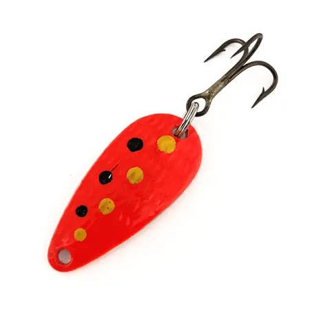 Tepaná textura pokrývá tělo této plandavky Thomas Cyclone UV a zajišťuje, že kov zachycuje světlo ze všech úhlů. Tato nástraha o délce 1 1/4" (3 cm) s kódem 11492 má fluorescenční oranžový základ s ručně nanášenými žlutými a černými tečkami. Pod UV světlem povrchová úprava výrazně září, což je konstrukční prvek určený pro prostředí se sníženou viditelností nebo hlubší vody. Tato plandavka o hmotnosti 1/8 oz (4,3 g) je vyrobena v USA a zachovává si původní osazení, včetně kroužku a bronzového trojháčku. Exemplář zůstává ve stavu 5/5, přičemž povrchová úprava i kovové součásti vypadají čistě a zachovale.