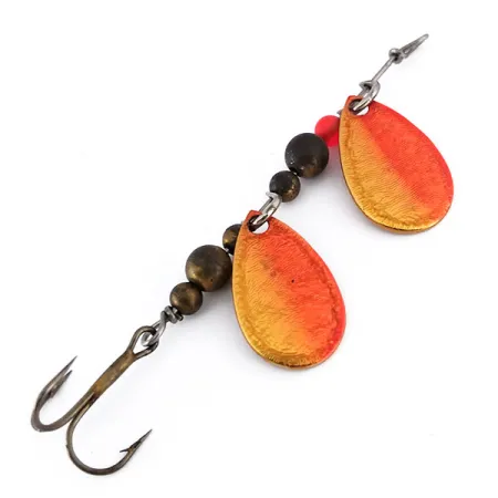 Tato rotační třpytka se dvěma lístky o délce 7 cm (2 3/4") je ukázkou klasického amerického řemesla značky Thomas hardware. Každý ze dvou lístků ve tvaru kapky je vyveden v barevném přechodu Gold / Red, kde kovově zlatý základ přechází do sytého oranžovo-červeného odstínu. Na zadní straně lístků se nachází autentické ražby výrobce identifikující nástrahu jako THOMAS DOUBLE SPINN, přičemž údaje o hmotnosti jsou hluboce vlisovány do kovu. Vnitřní sestava se skládá z tmavých mosazných korálků různých velikostí, doplněných jedním výrazným červeným korálkem v horní části drátěného těla. V zadní části je upevněn trojháček v tmavé povrchové úpravě, který doplňuje účelnou estetiku této vintage nástrahy vyrobené v USA. Tento exemplář o hmotnosti 5 g (3/16 oz) s označením 10133 má hodnocení 5/5 a vykazuje mimořádně čistý povrch u lakovaných i ražených částí.