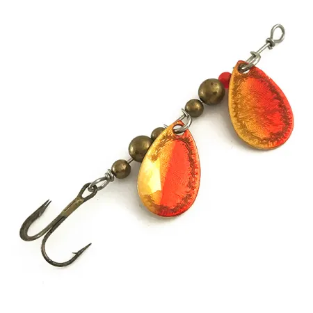 Tato tandemová rotačka o celkové délce 7 cm (2 3/4") představuje klasické americké řemeslo, které je pro značku Thomas typické. Dva kapkovité listy jsou na přední straně opatřeny texturovaným zlato-červeným přechodem, navrženým pro vysokou viditelnost v různých vodních podmínkách. Tělo o hmotnosti 5g (3/16oz) se skládá z několika masivních mosazných korálků a jednoho červeného plastového korálku, který slouží jako nenápadný spouštěcí bod. Na spodní straně leštěných zlatých listů je jasně vyražen název výrobce a původ v USA, což potvrzuje její historii. Tento exemplář s produktovým kódem 6532 je ve vynikajícím stavu s hodnocením 5/5. Na konci je osazen bronzový trojháček, připravený k vodě nebo do sběratelské vitríny.