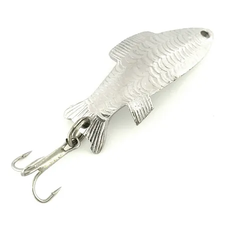 Tento exemplář s ikonickým textem „FIGHTING FISH“ vyraženým na konkávní zadní straně ukazuje přímočarou účelnost, kterou jsou nástrahy Thomas známé. Při hmotnosti 1/4 oz (7 g) poskytuje niklový povrch vysoce kontrastní odlesk proti detailnímu vzoru šupin, který pokrývá konvexní stranu. Tato plandavka vyrobená v USA měří na délku 1 1/2" (4 cm) a vyznačuje se klasickým profilem ve tvaru ryby určeným pro přívlač a trolling. Součástí výbavy je robustní kroužek a čistý trojhák, což zachovává integritu tohoto vintage designu. Nástraha s přiřazeným kódem produktu 7241 je ve vynikajícím stavu 5/5 a zachovává si jasný kovový lesk. Malé očko pro navázání v přední části doplňuje konstrukci této tradiční americké plandavky.