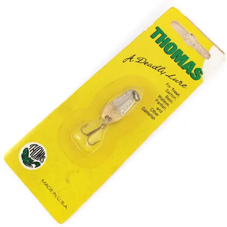 Tato kompaktní plandavka s vyraženým označením „TIGER“ přímo na kovovém povrchu se zlatou úpravou představuje klasickou éru amerického designu rybářského náčiní. Váží 1/8 oz (3,2 g) a měří 1" (2,5 cm) na délku, přičemž zůstala zachována ve svém původním žluto-zeleném továrním balení. Tento model Thomas Little Tiger, identifikovaný produktovým kódem 9998, se vyznačuje jasně zlatým povrchem navrženým tak, aby odrážel světlo při nahazování nebo trollingu. Na obalu je výslovně uveden původ „MADE IN U.S.A.“ a je určena pro širokou škálu dravých ryb, od okounovitých až po lososy. Jako nepoužitý exemplář (stav: 6) si nástraha zachovává svůj tovární vzhled, a to včetně původního tmavého trojháčku a čirého blistru. Kruhové zelené logo v levém dolním rohu dotváří klasickou vizuální identitu značky na jasně žlutém pozadí.