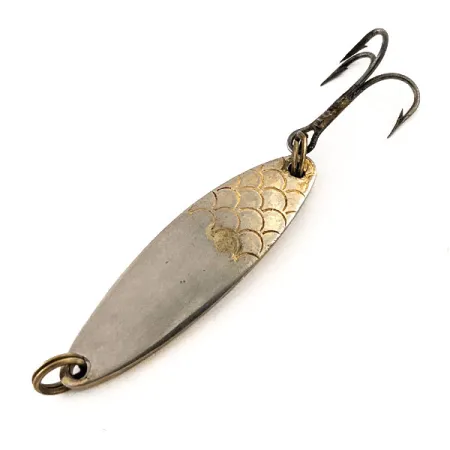 Tělo této 3,7 cm (1 1/2") plandavky je postříbřené a na horní části konvexní strany nese výrazný ražený vzor šupin. S hmotností 7 g (1/4 oz) je tato celokovová nástraha navržena pro efektivní nahazování a prezentaci v hluboké vodě v různých sladkovodních podmínkách. Na konkávní spodní straně je zřetelně vidět logo Thomas spolu s ikonou ryby, což potvrzuje původ v USA a tradici výroby z poloviny minulého století. Výbava zahrnuje jeden trojháček připevněný pomocí robustního kroužku, přičemž na konci pro navázání vlasce je rovněž odpovídající kroužek pro bezpečné uchycení. Tento exemplář s produktovým kódem 13111 je ve stavu 5/5, zachovává si lesklý povrch a ostré rytiny na celém stříbrném povrchu.