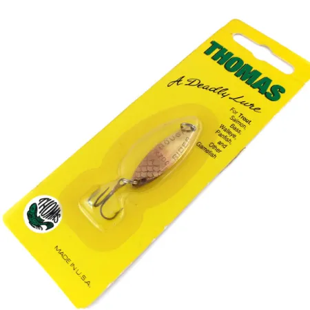Měděné pokovení kryje tělo se šupinatým vzorem této klasické plandavky a poskytuje vysoce lesklý povrch navržený k upoutání pozornosti pstruhů a lososů. Plandavka Thomas Rough Rider o hmotnosti 1/4oz (7 g) se vyznačuje výrazným texturovaným povrchem, který napodobuje přirozené šupiny nástražních rybek. Tento exemplář s produktovým kódem 9997 měří na délku 3,7 cm (1 1/2") a zůstává v původním továrním balení se žlutým podkladem. Ražba na kovové straně jasně zobrazuje název modelu „ROUGH RIDER“, což odráží kvalitu americké výroby. Tato nástraha je nepoužitá a zůstává v původním stavu z obchodu, s hodnocením stavu 6. Bezpečně je připevněn trojhák s bronzovou povrchovou úpravou, vhodný pro nahazování v potocích nebo trolling na horských jezerech. Dobové balení uvádí účinnost na candáty a okounovité ryby, což dokládá všestrannost, díky níž si nástrahy Thomas drží místo v rybářských boxech po celá desetiletí.