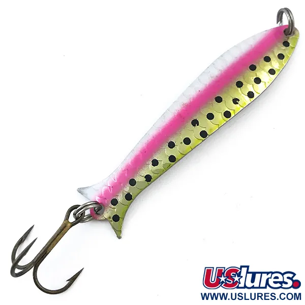 Tato 6,5cm (2 1/2") plandavka, ražená na rubové straně s klasickým logem a označením hmotnosti, se vyznačuje odolným niklováním, které je synonymem pro americkou výrobu značky Thomas. Povrchová úprava Trout / Nickel je obzvláště působivá a kombinuje výraznou neonově růžovou postranní čáru se zlatozelenými akcenty šupin a řadou sytě černých teček. Nástraha o hmotnosti 5 g (3/16 oz) je speciálně konstruována pro trolling a využívá štíhlý, protáhlý profil pro maximální viditelnost v různých světelných podmínkách. Tento konkrétní exemplář s produktovým kódem 5040 je ve stavu 5/5, přičemž barva i osazení vypadají výjimečně zachovale. Je osazena dvěma pevnými kroužky a ostrým trojháčkem na zádi, což podtrhuje kvalitní zpracování očekávané od vintage nástrahy vyrobené v USA.