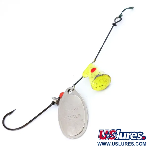 Jméno jasně vyražené do oválného niklového listu identifikuje tento model Royal Canadian jako klasický kousek historie značky Spin-Erie. S celkovou délkou 10 cm (4") a hmotností 17 g (3/5 oz) využívá tato nástraha robustní drátěný rám navržený pro kanadské sladkovodní ryby. Třpytka má jasně žlutě lakovanou hlavu s červenými tečkami, za kterou následuje ladící červený korálek a leštěný rotační list ve stříbrném tónu. Stav je hodnocen 5/5; exemplář vykazuje pozoruhodné zachování s lesklými kovovými povrchy a ostrým nátěrem na zátěžovém těle. Ve spodní části je integrován velký jednoháček, zatímco horní drát je zakončen krouceným očkem pro vlasec. Sběratelé najdou pod produktovým kódem 10348 tuto konkrétní barevnou kombinaci niklu a žluté.