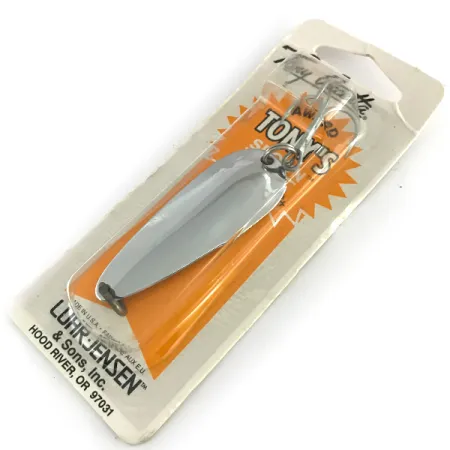 Poniklovaný povrch o délce 5,5 cm (2 1/4") definuje reflexní plochu této plandavky Tony Accetta Tony’s Spoon. Tato 11g (2/5 oz) nástraha s produktovým kódem 8454 je prvotřídním příkladem éry Luhr Jensen & Sons z Hood River v Oregonu. Je nepoužitá a zachovaná v původním vintage blistru s klasickou oranžovou grafikou a historickými údaji o firmě na zadní straně. Plandavka je navržena pro jednoduché použití při přívlači nebo trollingu a je vybavena prostým předním očkem a jedním koncovým háčkem připevněným spolehlivým kroužkem. Ražený kov si zachovává svůj jasný lesk bez jakýchkoli známek opotřebení způsobených skladováním.