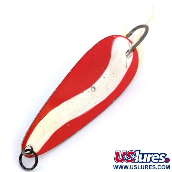 Vlnitý červeno-bílý smaltovaný vzor pokrývá konvexní stranu této poniklované plandavky, což je design neodmyslitelně spjatý s americkou přívlačí poloviny minulého století. Tento model Tony Accetta Weed Doger s produktovým kódem 10607 váží 1/3 unce (10 g) a měří 2 1/4" (5,5 cm). Konkávní strana odhaluje čistou, raženou značku „TONY ACCETTA“ a jednoháček opatřený žlutým péřovým přívěsem zajištěným červenou nití. Pro usnadnění lovu v husté vegetaci je osazena drátěnou ochranou proti vázkám. Ve stavu 4/5 vykazuje plandavka jemné stopy používání, které odkazují na její historii, zatímco kov zůstává lesklý a barvy jsou syté. K přednímu očku je připevněn jednoduchý černý kroužek pro připojení vlasce.